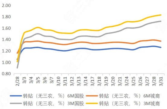 财联社4月2日讯 3月份信贷大月落幕,票据利率成为观察信贷需求的风向标。财联社发现,今年3月末票据利率上行幅度有限,3个月和6个月国股转贴利率最后一周分别上行14bp和4bp,银行卖票力度亦不及往年。机构分析指出,3月信贷投放部分依赖票据冲量,预计4月票据利率将震荡下行。