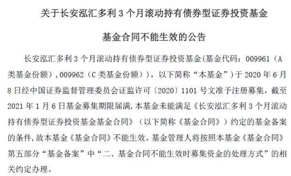 中国经济网北京1月11日讯 (记者康博) 近日,长安基金公司官方宣布,其旗下的长安泓汇多利3个月滚动持有债券型基金募集期限届满,未能满足《基金合同》中规定的备案条件,导致该基金合同无法生效。该基金也因此成为2021年首只募集失败的基金。