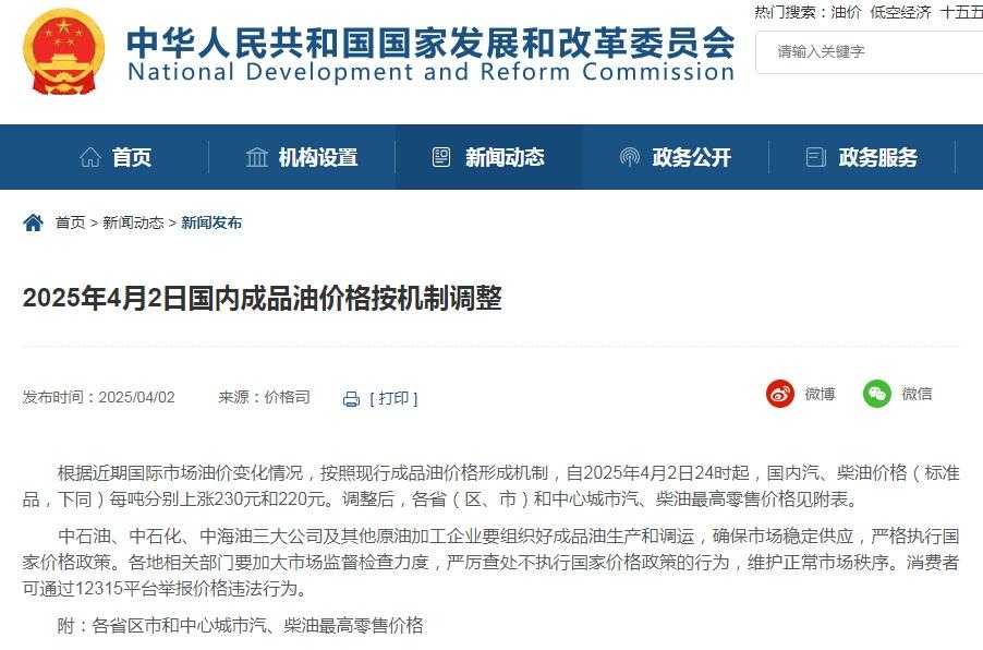 国家发改委宣布,自2025年4月2日24时起,国内汽、柴油价格每吨分别上涨230元和220元。据测算,加满一箱50L的92号汽油将多花9元左右。国家发改委要求确保市场稳定供应,严厉查处价格违法行为。本次油价调整是年内第三次上涨。
