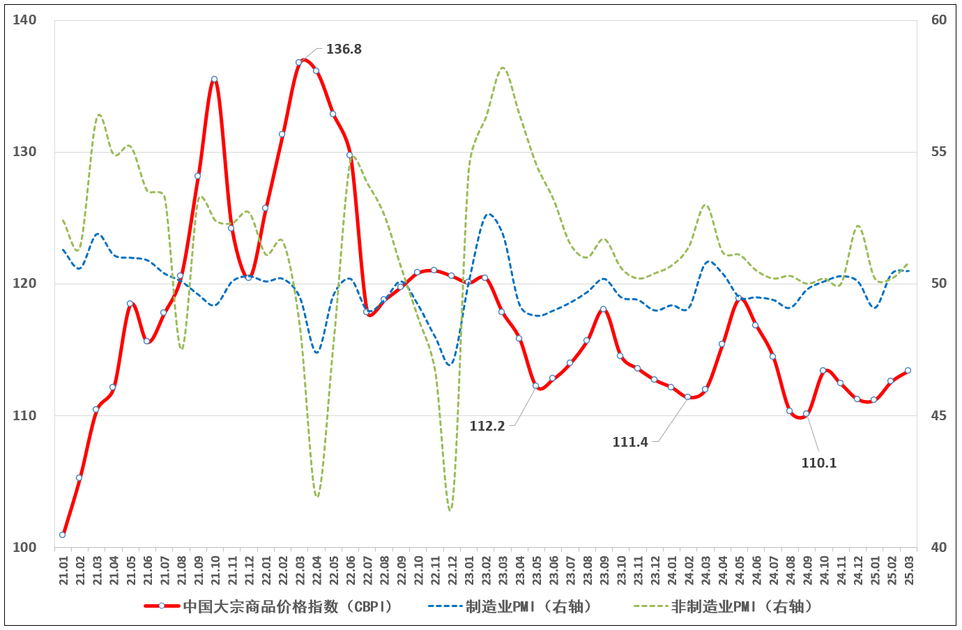 2025年3月中国大宗商品价格指数环比上涨0.7%,同比上涨1.3%。有色金属价格涨幅扩大,农产品价格指数走高,焦炭、丁苯橡胶和焦煤跌幅前三。外部风险增多,大宗商品价格波动加剧。