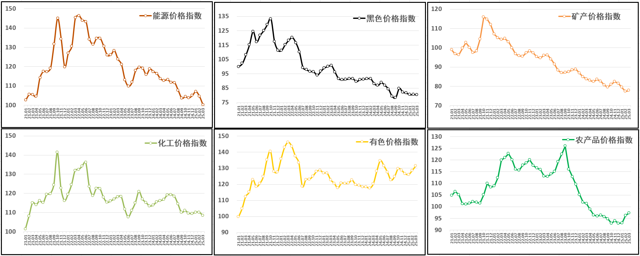 分行业看,有色价格指数涨幅扩大,报131.4点,月环比上涨2.2%,年同比上涨9.3%;农产品价格指数继续走高,报97.3点,月环比上涨1.1%,年同比下跌3.9%;矿产价格指数止跌反弹,报77.9点,月环比上涨0.6%,年同比下跌7.1%;黑色价格指数有所回落,报80.3点,月环比下跌0.3%,年同比下跌8.9%;化工价格指数小幅走低,报108.5点,月环比下跌1.5%,年同比下跌6.6%;能源价格指数破位下行,报100.1点,月环比下跌4.3%,年同比下跌11.9%。