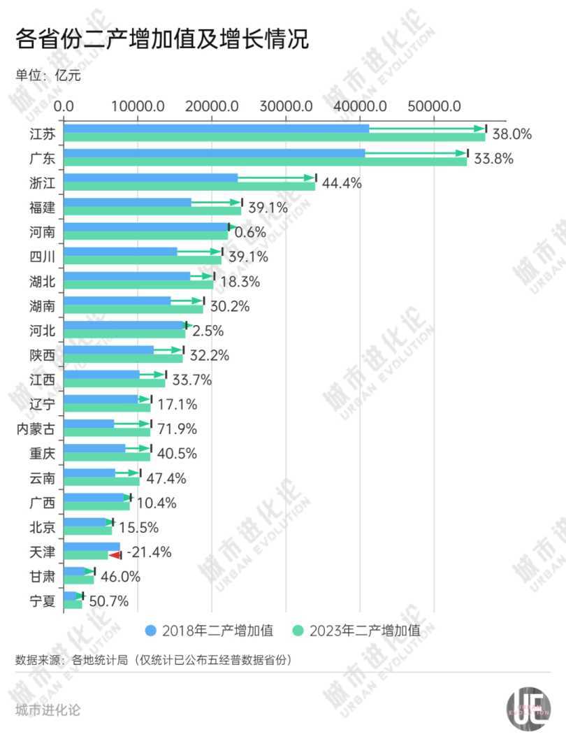 值得关注的是,江苏、浙江、福建等沿海地区二产从业人员降幅较大,同时第二产业增加值涨幅也较大;相比之下,广东同样作为工业大省,情况却与经济体量接近的江苏不一。广东的二产增加值涨幅低于江苏,但二产从业人员数量仍在上升。