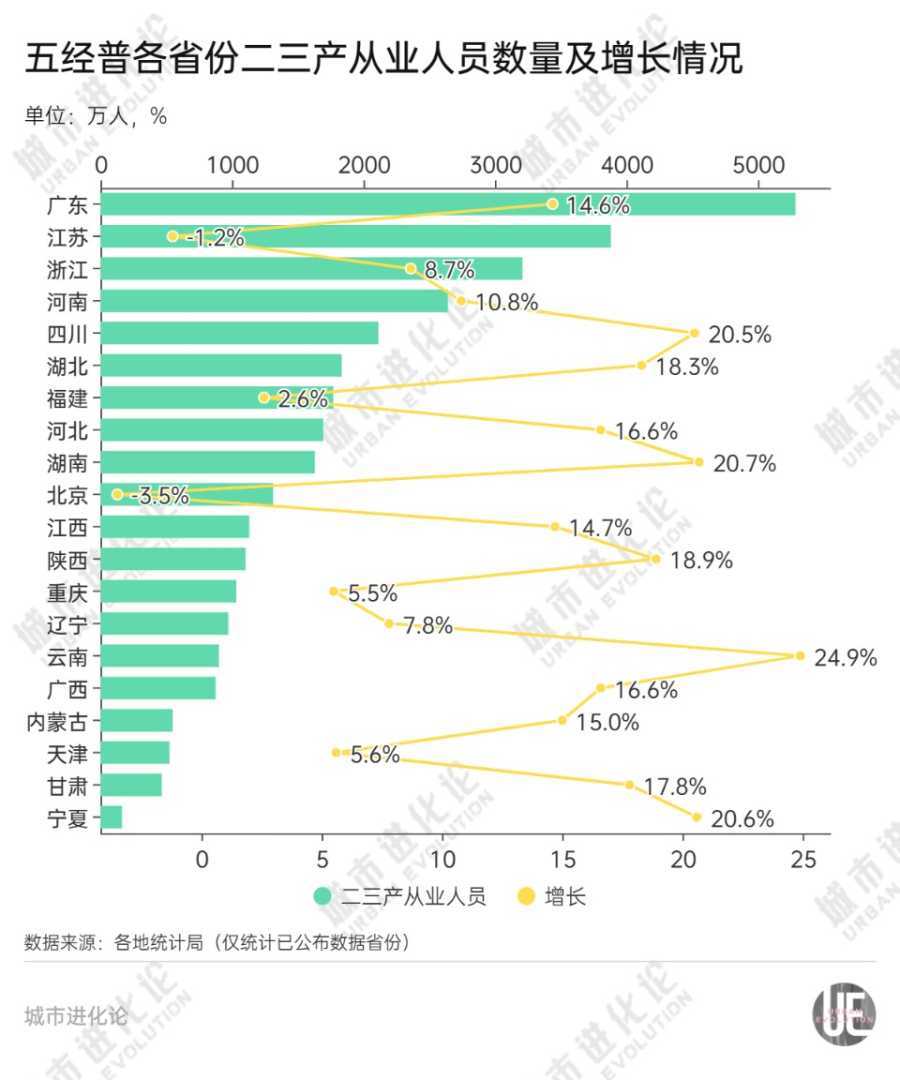 根据城市进化论的梳理,截至目前,至少已有20个省份公布了省级层面的第五次经济普查(下称“五经普”)公报。其中,有一项重要数据是从业人员数量。已公布数据的省份中,绝大部分第二产业和第三产业法人单位从业人员(下称“二三产从业人员”)都在增加,但北京和江苏却是个例外,它们的二三产从业人员在过去5年间减少了。