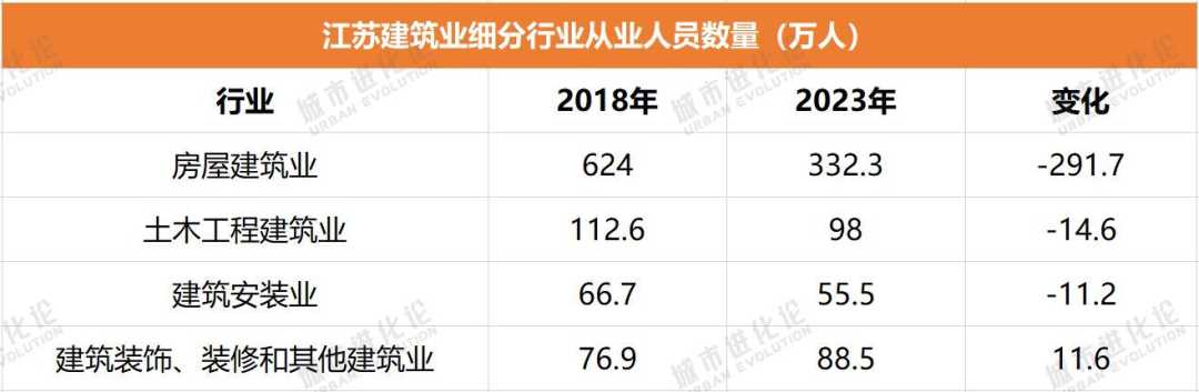江苏二产法人单位从业人员数量最多的前三大行业中,制造业下降了76.9万人,建筑业下降了305.9万人,批发和零售业上涨了61.3万人。也就是说,江苏从业人员减少量最主要来自建筑业。