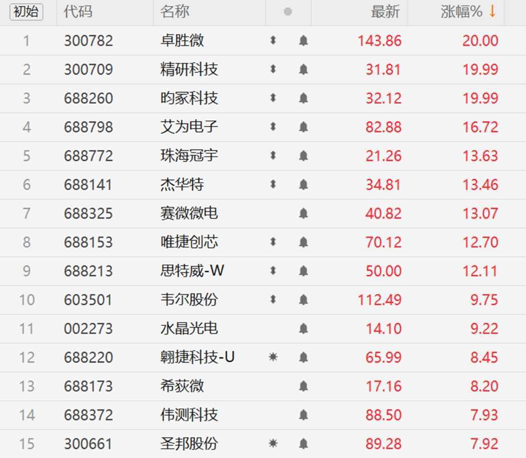 受到发布会消息催化,今晨消费电子产业链多股走高,卓胜微、精研科技、昀冢科技等个股涨停,其他相关个股如艾为电子、珠海冠宇等也大幅走高。