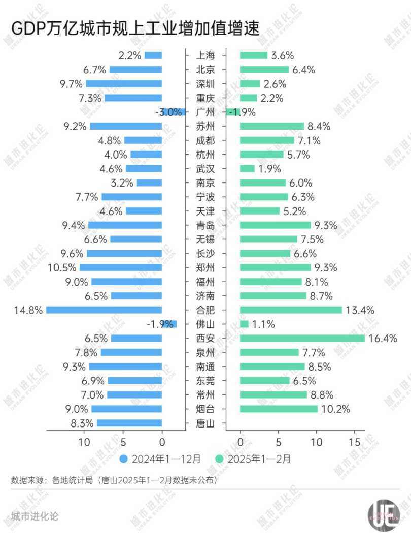 解读:西安工业增速领跑万亿城市,新能源汽车产业成主因。2024年全年,西安GDP增长4.6%,未能跑赢全国平均增速;规上工业增加值增长6.5%。进入2025年,西安工业增速高达16.4%,领跑万亿城市。新能源汽车产业仍是带动西安工业增长的主因之一,1—2月,西安汽车产量增长56.4%,其中新能源汽车产量增长69.2%,汽车制造业增加值增长46.8%。