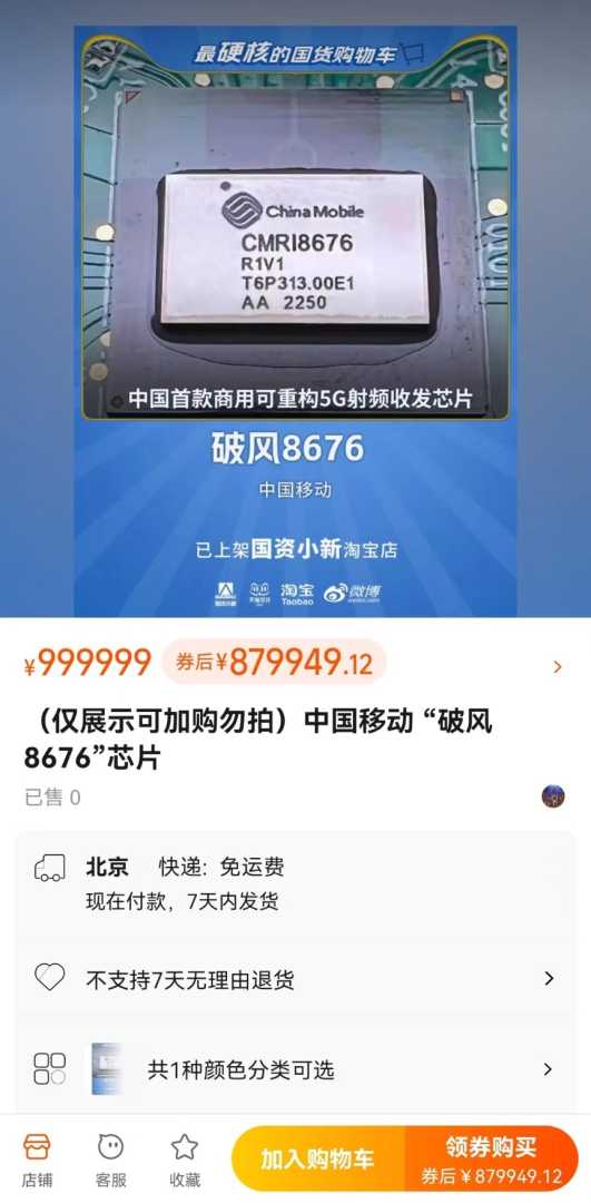 10月30日,第一财经记者注意到,一款编号为CMRI8676的5G芯片悄然出现在淘宝商城“国资小新”店铺中。这款名为“破风8676”的芯片,被标榜为中国首款商用可重构5G射频收发芯片,定价高达人民币999999元,迅速成为网友热议的焦点,被誉为“双十一”期间最“硬核”的国货。