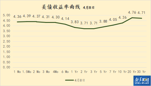 4月9日早盘,2年期美债收益率上升6.5BPs至3.806%;10年期美债收益率一度飙升至4.515%,较4月4日的低点高出50BPs;30年期美债收益率最高触及5.023%,跳涨28BPs。2年期与10年期美债收益率利差大幅走阔,从周二的55BPs再次扩大到75BPs。