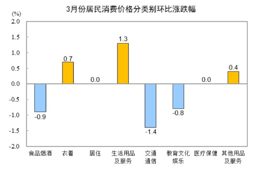 环比方面,3月份食品烟酒类价格环比下降0.9%,鲜菜价格下降5.1%,蛋类价格下降2.7%,畜肉类价格下降2.2%,其中猪肉价格下降4.4%。其他七大类价格环比三涨两平两降,交通通信、教育文化娱乐价格分别下降1.4%和0.8%。