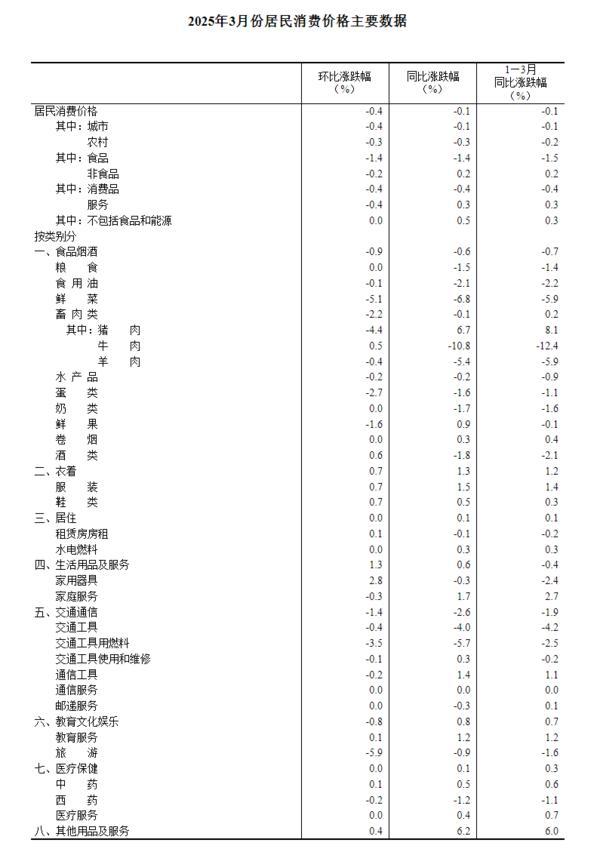 中国网财经4月10日讯 国家统计局网站发布数据显示,2025年3月份,全国居民消费价格同比下降0.1%。其中,城市下降0.1%,农村下降0.3%;食品价格下降1.4%,非食品价格上涨0.2%;消费品价格下降0.4%,服务价格上涨0.3%。1—3月平均,全国居民消费价格比上年同期下降0.1%,显示消费市场平稳运行。
