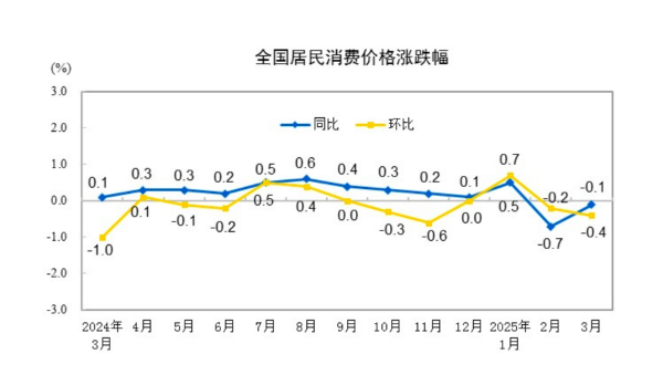 国家统计局4月10日发布的数据显示,3月份居民消费价格指数(CPI)环比下降0.4%;同比下降0.1%,降幅比上月收窄0.6个百分点;工业生产者出厂价格指数(PPI)环比下降0.4%,同比下降2.5%。