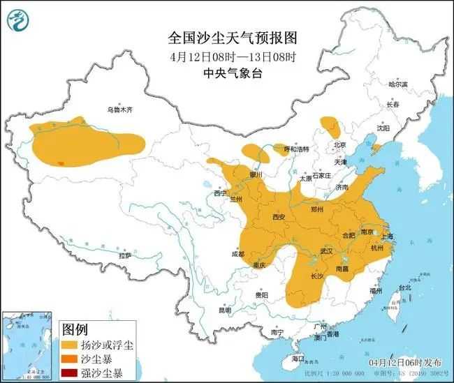 受冷空气大风影响,预计4月12日8时至13日8时,内蒙古西部、新疆南部、甘肃中东部、宁夏中南部、陕西中南部、山东东部和南部、河南、安徽、江苏、上海、湖北、湖南、广西北部、江西北部、浙江中北部、四川盆地中北部等地的部分地区有扬沙或浮尘天气,其中,新疆南部等地局部有沙尘暴。