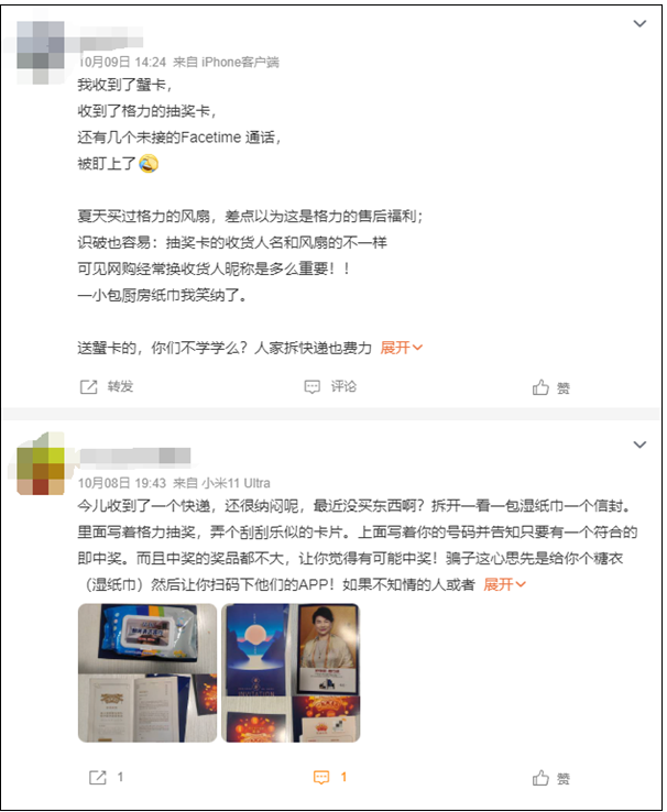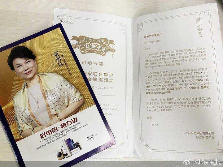 据北京商报报道,10月10日,市民王先生收到了一份陌生快递,内含一包厨房湿巾和一份印有董明珠照片的中秋礼品卡。礼品卡邀请王先生参加“一起撕豪礼”刮奖活动,声称最高可获得10000元现金奖励。卡片上标注着活动时间和游戏规则,并声称共发出了10万份邮件。