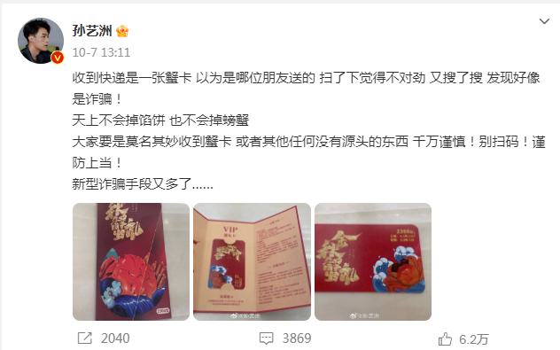 此外,演员孙艺洲也曾遭遇类似骗局,他在微博上发文称收到一张大闸蟹礼品卡快递,但最终发现是刷单诈骗。这一话题还冲上了热搜第一,引发广泛关注。