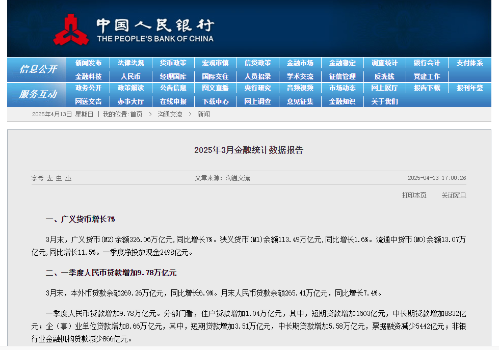 4月13日,央行发布2025年3月金融统计数据报告。数据显示,截至2025年3月末,社会融资规模同比增长8.4%,人民币贷款余额同比增长6.9%,广义货币供应量(M2)同比增长7%,金融继续保持对实体经济稳固的支持力度。