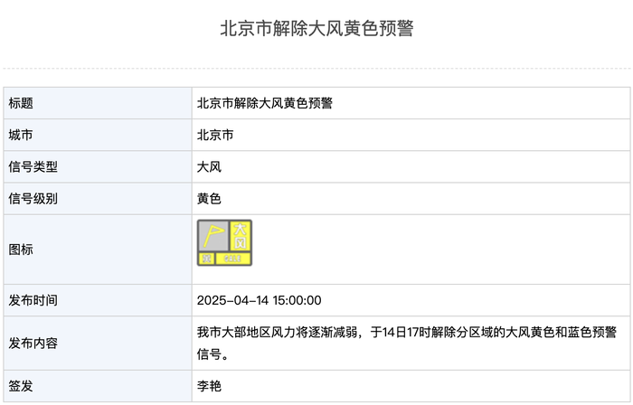 北京市已解除大风黄色预警,大部地区风力将逐渐减弱,并于14日17时正式解除分区域的大风黄色和蓝色预警信号。市民需关注天气变化,合理安排出行计划,确保出行安全。
