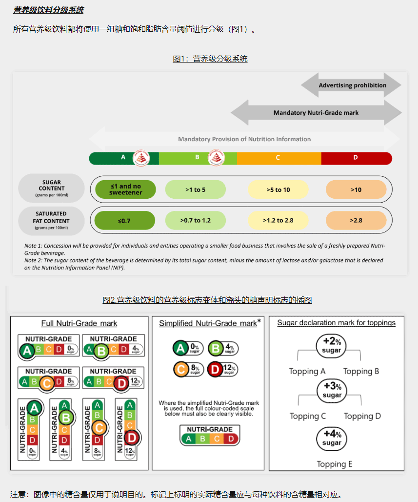 新加坡去年底已开始实行饮料分级制度,将饮料分为A-D四个等级,根据含糖量和饱和脂肪含量进行划分,并在包装上明确显示糖含量百分比。分级为“C”或“D”的饮料必须在包装正面贴上营养级标记,且禁止在媒体平台投放“D”级饮料广告。
