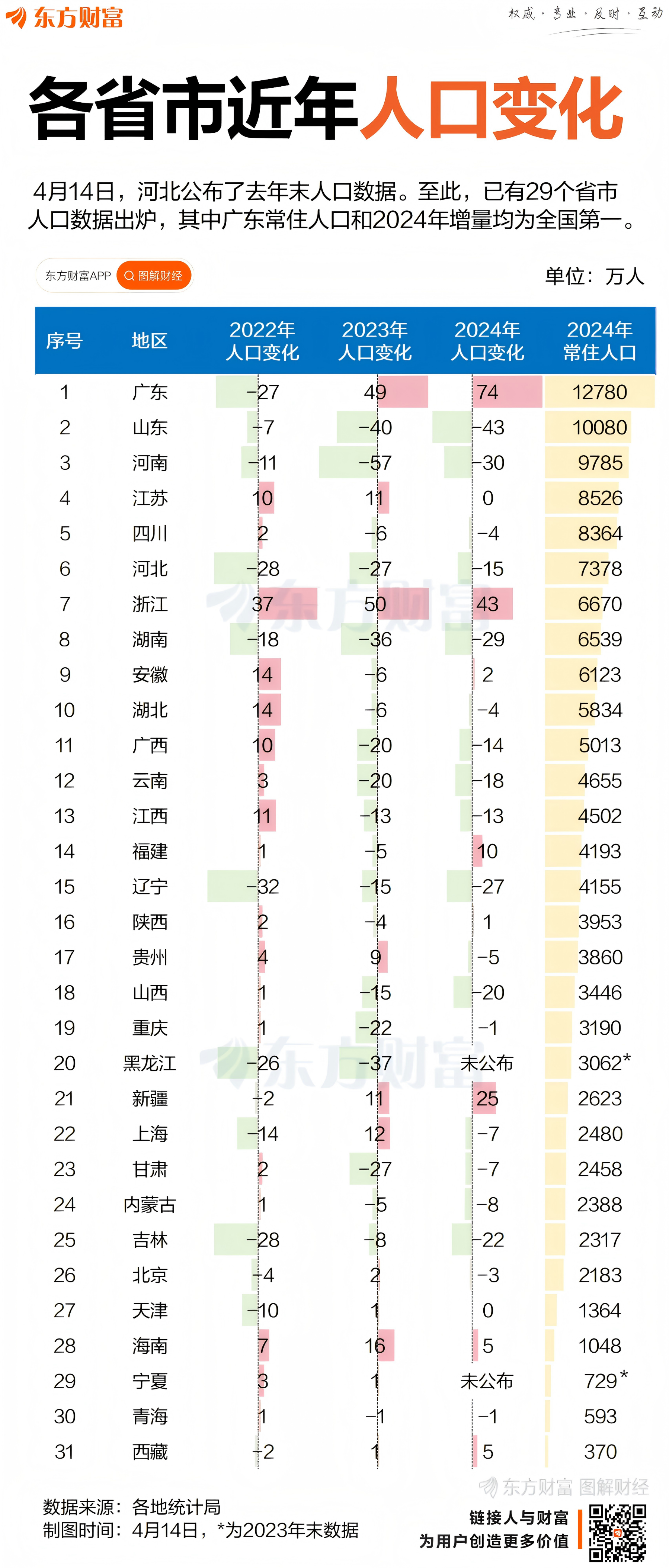 4月14日,河北省统计局公布了《河北省2024年国民经济和社会发展统计公报》。2024年末,广东、浙江常住人口增长领先,广东增超70万人重回第一。而山东、河南等省份常住人口减少较多。人口变化反映了各地经济社会发展态势。