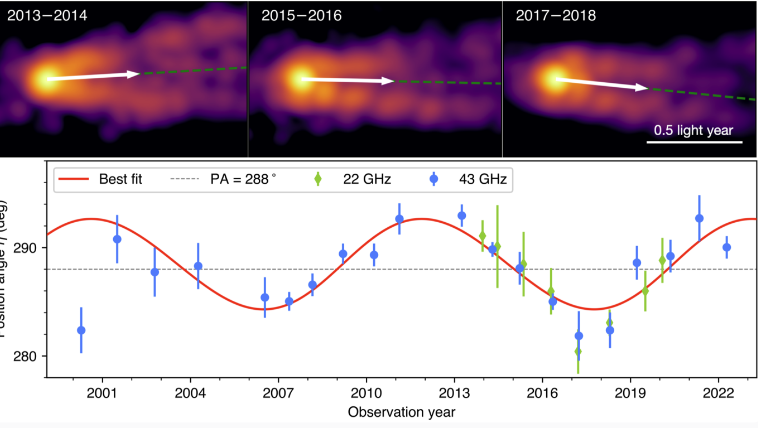 据新华社报道,论文第一作者兼通讯作者、之江实验室博士后崔玉竹介绍,科研人员利用VLBI技术,在解析M87黑洞喷流结构过程中,发现东亚VLBI网在2017年3月观测到的M87黑洞喷流指向与以往有所不同。经过深入分析近23年来全球多个VLBI网的观测数据,最终确认了黑洞喷流的周期性摆动。