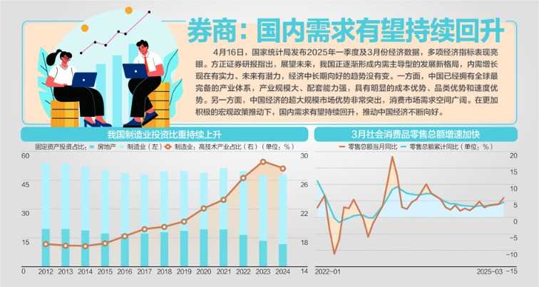 2025年一季度,我国GDP同比增长5.4%,显示出经济稳中向好的态势。宏观政策如“两新”政策、房地产政策调整等已显现积极效果,带动了消费和投资的双重增长。一季度经济运行总体表现良好,高质量发展向新向好。