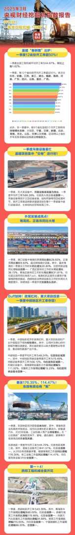 一季度,工程机械行业迎来传统开工及销售旺季,挖掘机销量同比增长22.8%,出口同比增长5.49%。基建“春耕图”出炉,12省份开工率超50%。吊装设备表现突出,基建项目集中交卷。西部地区外贸发展势头强劲,中部地区政策红利加持,开工率夺冠。东部地区经济趋势向好,装备制造业和高技术制造业成为主要动力。