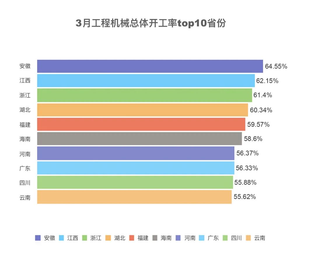 一季度,全国工程机械平均开工率为44.67%,同比上涨1.62%。其中,安徽、江西、浙江、湖北、福建、海南、河南、广东、四川、云南、重庆、广西等12个省份的平均开工率超过50%。