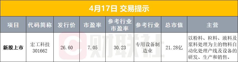 贝因美收行政监管措施决定书,*ST鹏博面临退市风险。华工科技拟回购3亿-4亿元股份。紫金矿业完成加纳金矿项目交割。芯朋微第一季度净利润同比增长73%。城地香江中标5.95亿元数据中心项目。*ST汉马撤销退市风险警示。苏美达拟购买蓝科高新股份,蓝科高新拟收购蓝亚检测等。宁波方正筹划购买骏鹏通信股权。中国中铁获工商银行16亿元回购贷款承诺。九联科技拟收购能通科技股份。宏景科技签署2.35亿元算力组网合同。国民技术拟发行H股上市。光韵达拟收购亿联无限股份。