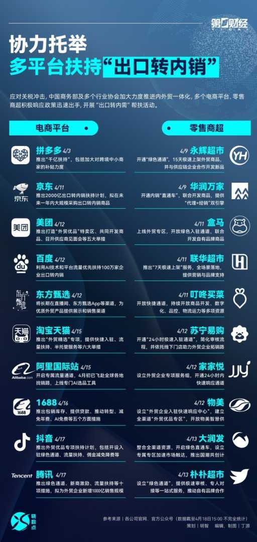 为有效应对关税冲击,中国商务部携手行业协会推进内外贸一体化,电商平台与零售商超积极响应,开展“出口转内需”帮扶活动,旨在助力企业开拓国内市场,促进经济内循环。