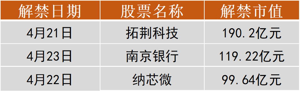 此外,本周超840亿元市值限售股解禁,Wind数据显示,本周(4月21日—4月25日)将有33只股票面临限售股解禁,合计解禁市值较大。其中,解禁市值居前三位的是拓荆科技、南京银行和纳芯微。