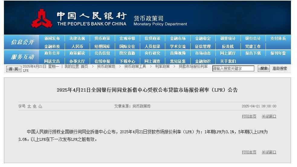 央行公布2025年4月LPR利率,引导实体经济融资成本下降
