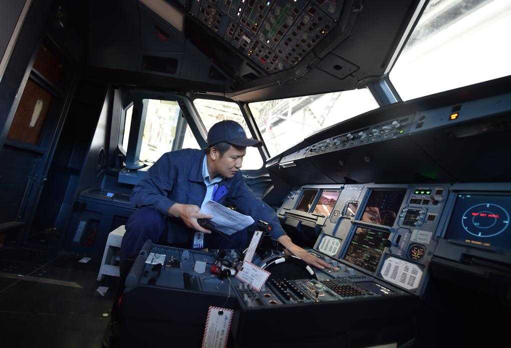 天津海特飞机工程有限公司工作人员在飞机机舱内进行检测作业。新华社记者赵子硕摄