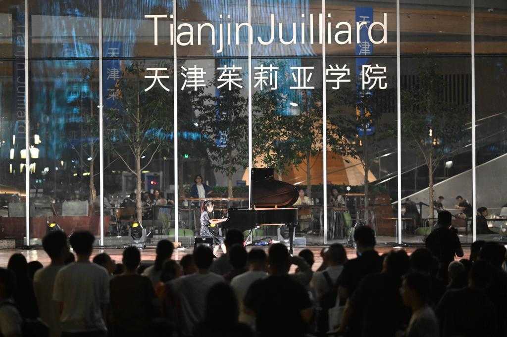 市民在天津茱莉亚学院户外舞台欣赏音乐会。新华社记者赵子硕摄