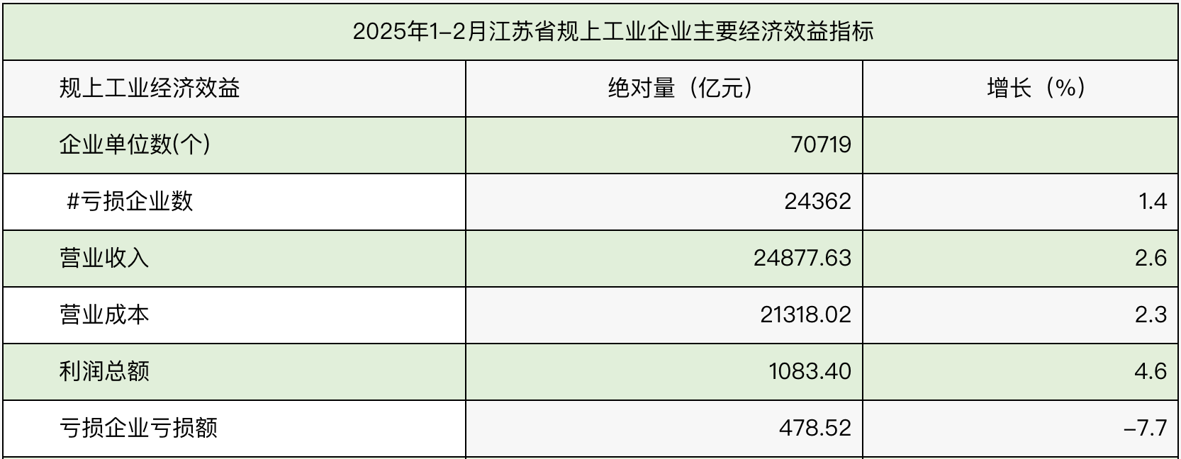 企业盈利水平方面,2025年1-2月,江苏省规上工业企业实现利润1083.40亿元,同比增长4.6%,利润总量全国第一。但利润水平仍处低位,需进一步巩固和加强。