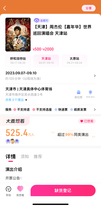 该售票平台数据显示,共有525万人“想看”这一场演出,远超99%同类演出。同时,该平台显示,本次周杰伦天津演唱会4场演出共计只有约10.54万张票,面对超500万人的“想看”,一票难求。