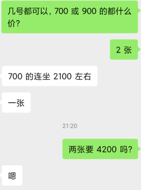记者联系了一位黄牛,该黄牛表示目前票价溢价都很高,原价700元的门票,目前单张售价达到2100元。也就是说,只要抢到票,转手就能赚1400元。