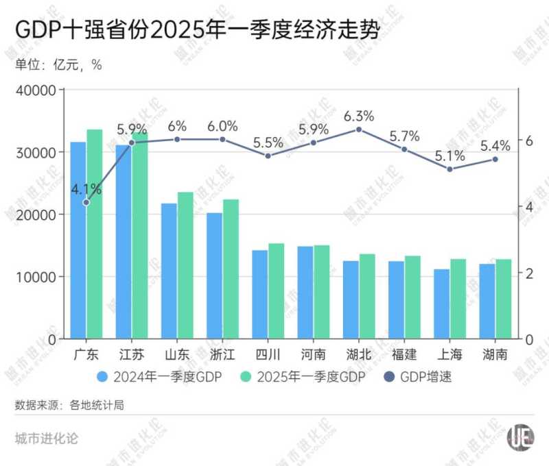 各地一季度经济数据陆续公布。截至4月23日,GDP十强省份最新经济成绩单已悉数出炉。其中,7个省份跑赢5.4%的全国平均增速,湖北以6.3%的增速领跑全国,表现抢眼。湖南GDP增速与全国持平,而广东(4.1%)、上海(5.1%)则未能跑赢全国大盘。