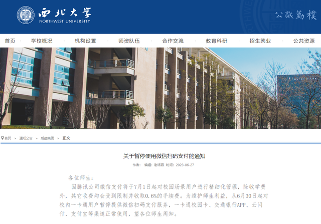 西北大学在公告中明确指出,由于腾讯公司微信支付自7月1日起对校园场景用户实施精细化管理,除学费收取外,其他收费项目均将受到限制,并加收0.6%的手续费。为维护师生利益,学校决定自6月30日起暂停一卡通用户的微信扫码支付服务,而一卡通校园卡、交通银行App、云闪付及支付宝等支付渠道将继续正常使用。