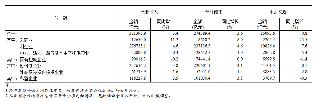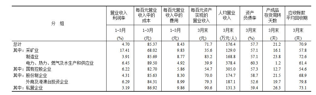 具体来看,1—3月份,规模以上工业企业中,国有控股企业实现利润总额5599.5亿元,同比下降1.4%;股份制企业实现利润总额11101.5亿元,增长0.1%;外商及港澳台投资企业实现利润总额3883.5亿元,增长2.8%;私营企业实现利润总额3709.7亿元,下降0.3%。