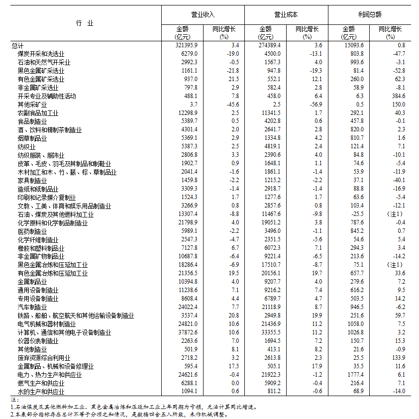此外,规模以上工业企业实现营业收入32.14万亿元,同比增长3.4%;发生营业成本27.44万亿元,增长3.6%;营业收入利润率为4.70%,同比下降0.12个百分点。应收账款和产成品存货也有所增长,分别增长9.9%和4.2%。
