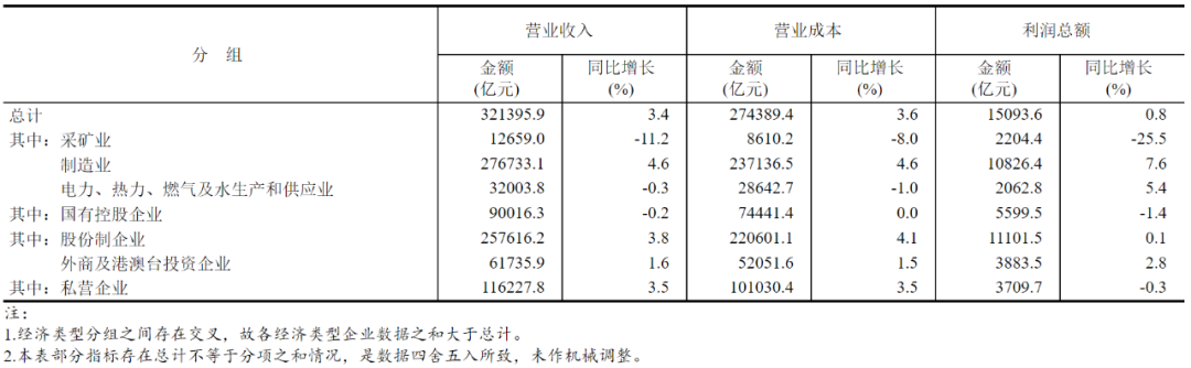 在此期间,国有控股企业利润同比下降1.4%,股份制企业增长0.1%,外商及港澳台投资企业增长2.8%,私营企业下降0.3%。从行业分类来看,制造业利润同比增长7.6%,电力、热力、燃气及水生产和供应业增长5.4%,而采矿业同比下降25.5%。主要行业中,农副食品加工业利润同比增长40.3%,有色金属冶炼和压延加工业增长33.6%,专用设备制造业增长14.2%,但煤炭开采和洗选业下降47.7%。