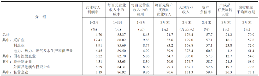 一季度,规模以上工业企业营业收入同比增长3.4%,营业成本增长3.6%,营业收入利润率为4.70%,同比下降0.12个百分点。3月末,规模以上工业企业资产总计同比增长5.3%,负债合计增长5.8%,所有者权益合计增长4.6%。