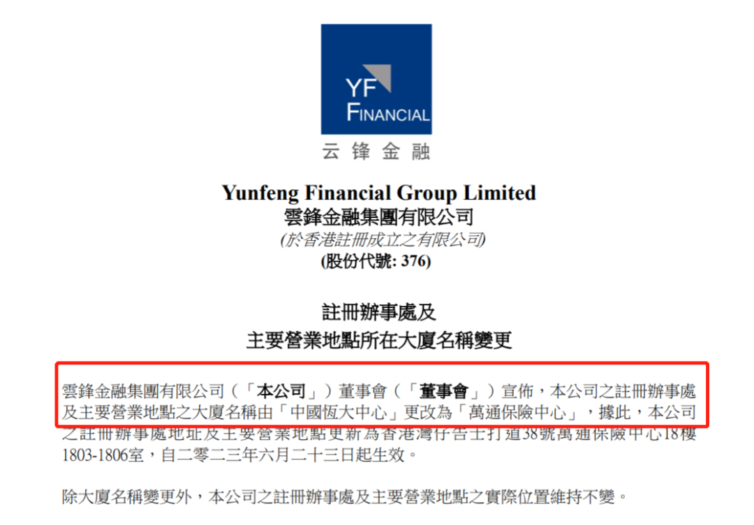 6月23日,H股上市公司云锋金融(00376,HK)发布正式公告,宣布其注册办事处及主要营业地点所在大厦的名称由“中国恒大中心”变更为“万通保险中心”。这一变动标志着中国恒大继2022年1月深圳总部大楼“摘牌”之后,又一重要办公地点被“摘牌”并更名。