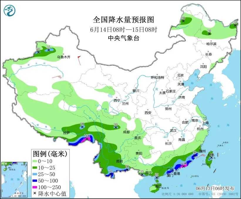 具体而言,13日,西藏东部、青海南部、吉林东部、四川西南部、云南大部、湖南南部、江西北部、浙江大部、福建北部、广西南部和东北部、广东大部、海南岛东部和南部、台湾岛大部等地部分地区有中到大雨,其中,西藏东南部、云南西部和南部、广西南部、广东中部和西南部、台湾岛南部、浙江东部等地局部有暴雨。14日,内蒙古东北部、黑龙江西部和东北部、新疆北疆沿天山地区西部、西藏东部、四川西部和南部、云南大部、广西南部、广东大部、福建南部和东部、海南岛大部、台湾岛等地部分地区有中到大雨,其中,西藏东南部、云南西北部和南部、广东中东部沿海、福建东南部等地局部有暴雨或大暴雨。15日,黑龙江北部、新疆沿天山地区、西藏东南部、青海东南部、四川东南部、重庆西部、云南东南部、广西南部、广东中南部、江西东南部、福建东南部、海南岛北部、台湾岛等地部分地区有中到大雨,其中,西藏东南部、广东中部沿海、台湾岛中南部等地局部有暴雨或大暴雨。