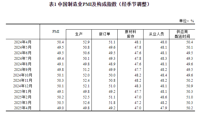 2025年4月,制造业采购经理指数(PMI)为49.0%,较上月下滑1.5个百分点,显示制造业景气水平略有回落。这一变化与全球经济形势及国内市场需求密切相关。
