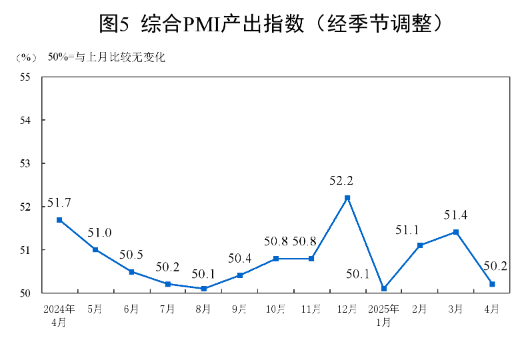 4月份,综合PMI产出指数为50.2%,较上月下降1.2个百分点,但仍高于临界点,表明我国企业生产经营活动总体保持扩张态势。