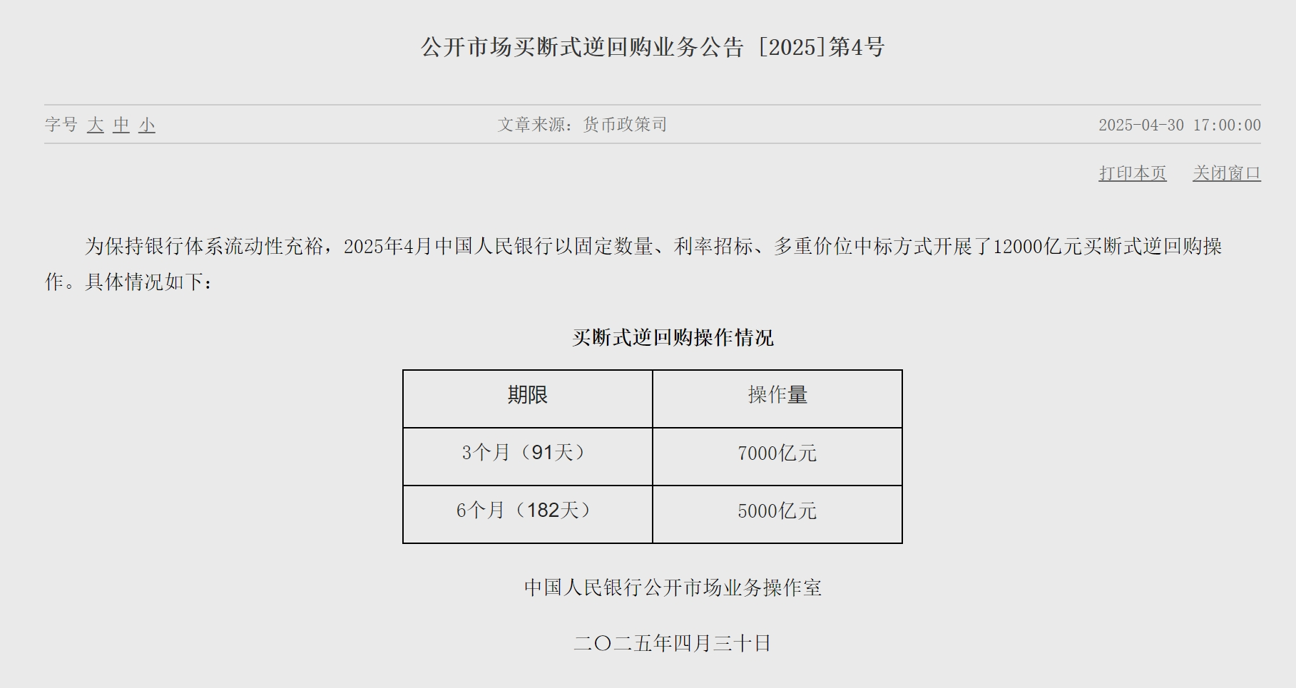 央广网北京4月30日消息(记者冯方)4月30日,为保持银行体系流动性充裕,央行发布公告称,2025年4月以固定数量、利率招标、多重价位中标方式,成功开展了12000亿元买断式逆回购操作,包括3个月期7000亿元和6个月期5000亿元。