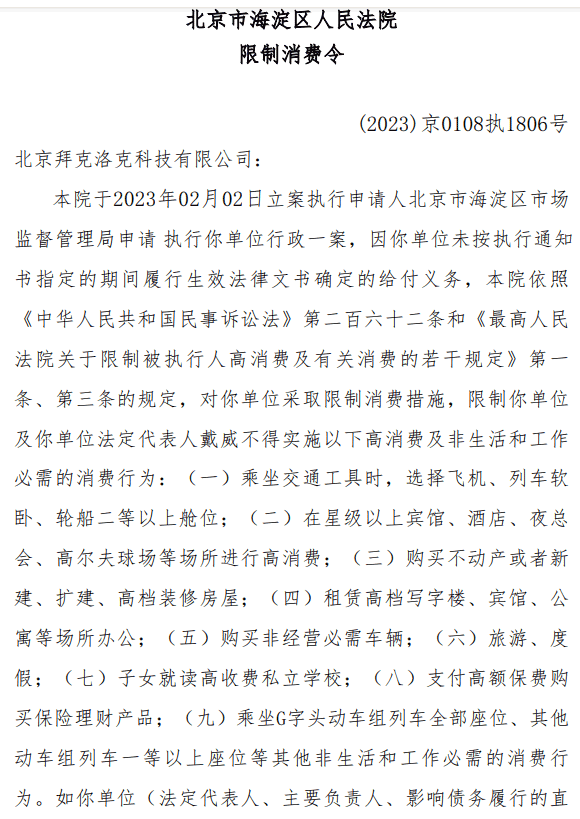 此外,天眼查网站显示,戴威名下的限制消费令时间跨度长达数年,最新一条由北京市海淀区人民法院发出。法院对戴威及北京拜克洛克科技有限公司的高消费及非生活和工作必需的消费行为进行了限制,但并未限制其出境创业。