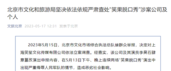 知名脱口秀喜剧公司笑果文化及其旗下演员HOUSE(李昊石)近日在微博热搜上引起广泛关注。17日中午,针对笑果文化旗下连续两场演出中出现的严重侮辱人民军队事件,北京市文化和旅游局作出严厉处罚:警告并没收违法所得1325381.6元,同时罚款13353816元;对涉案人员及其演出经纪机构进一步依法依规追究责任;无限期暂停涉事公司在京所有演出活动。