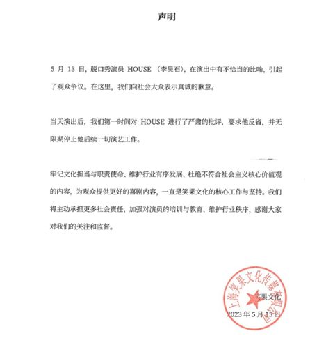 在事件发生后,笑果文化及HOUSE(李昊石)均发布了致歉信或声明。笑果文化承认旗下演员在表演中存在“不恰当的比喻”,并无限期停止涉事演员一切演艺工作。随后,中国演出行业协会要求会员单位对李昊石进行从业抵制,上海市文化和旅游局也责令笑果文化暂停在沪全部演出,并进行内部管理整顿。