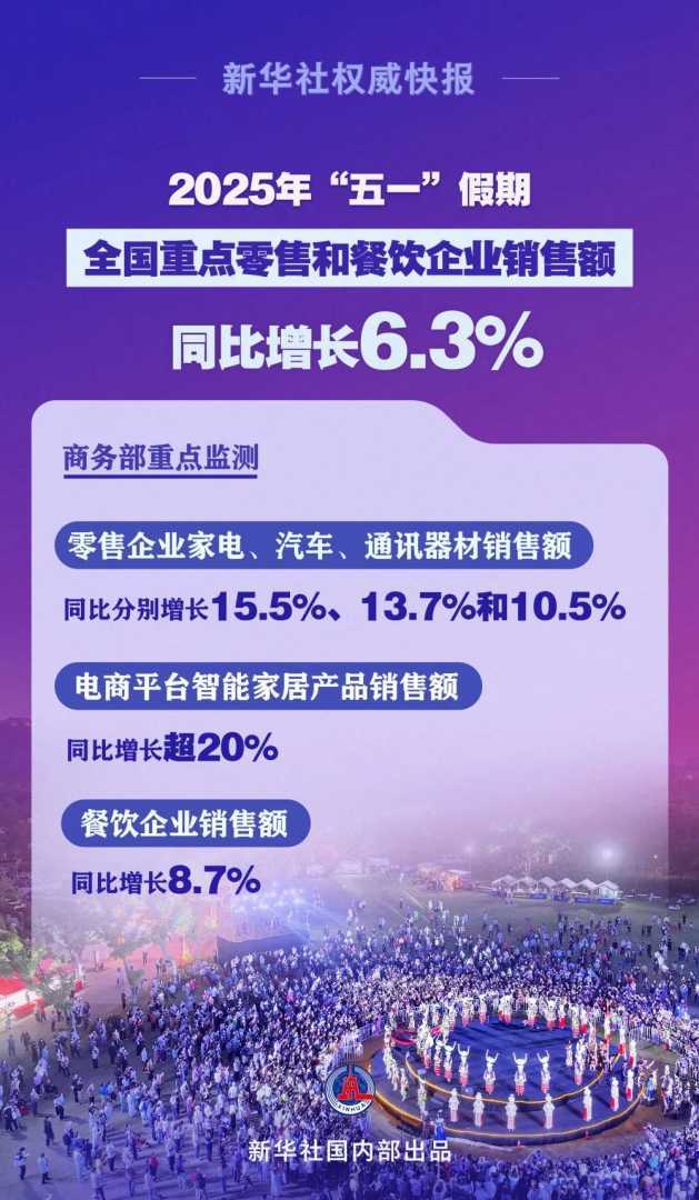 记者5月5日从商务部获悉,2025年“五一”假期,全国消费市场繁荣活跃。据商务部商务大数据监测,假期全国重点零售和餐饮企业销售额同比增长6.3%,展现出国内消费市场的强劲复苏态势。